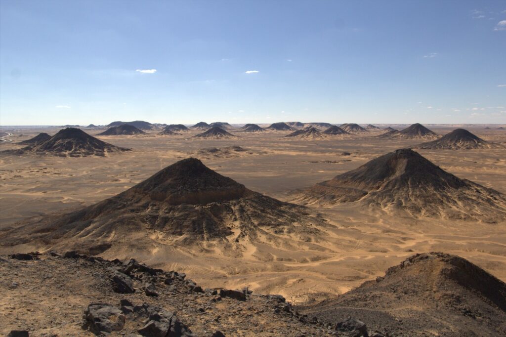 Explore the dramatic landscape of “El Sahara El Sowda,” the Black Desert, located between Bahariya Oasis and the White Desert. This striking region is defined by widely spaced volcanic mounds dating back to the Jurassic period, some towering up to 100 meters tall, and is renowned for their distinctive black basalt caps. These ancient hills, layered with iron, quartz, and sandstone, create a stark and mesmerizing contrast against the desert sands. A visit here offers a breathtaking glimpse into Egypt’s powerful and diverse geological history.